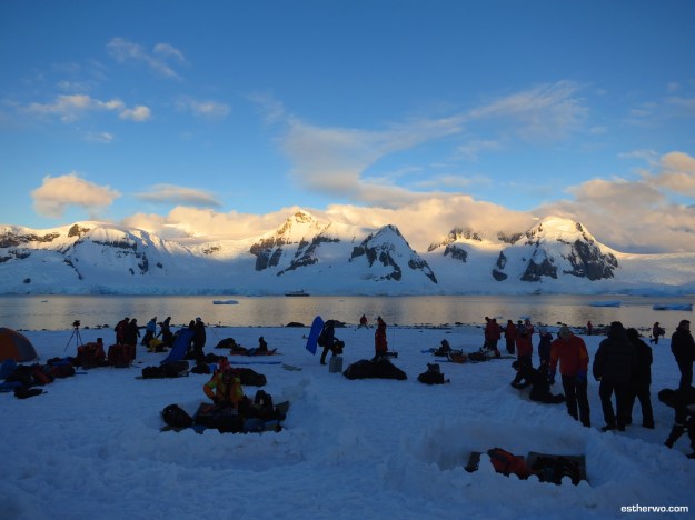We’re camping out on the ice! Arrived on land before 7:00pm and were immediately put to work to set up camp – shovels were being passed out and slowly, groups of people got together to dig their homes for the night. We had to dig a hole, level the snow, and build a small wall in the direction of the wind to block it from freezing us in the night.